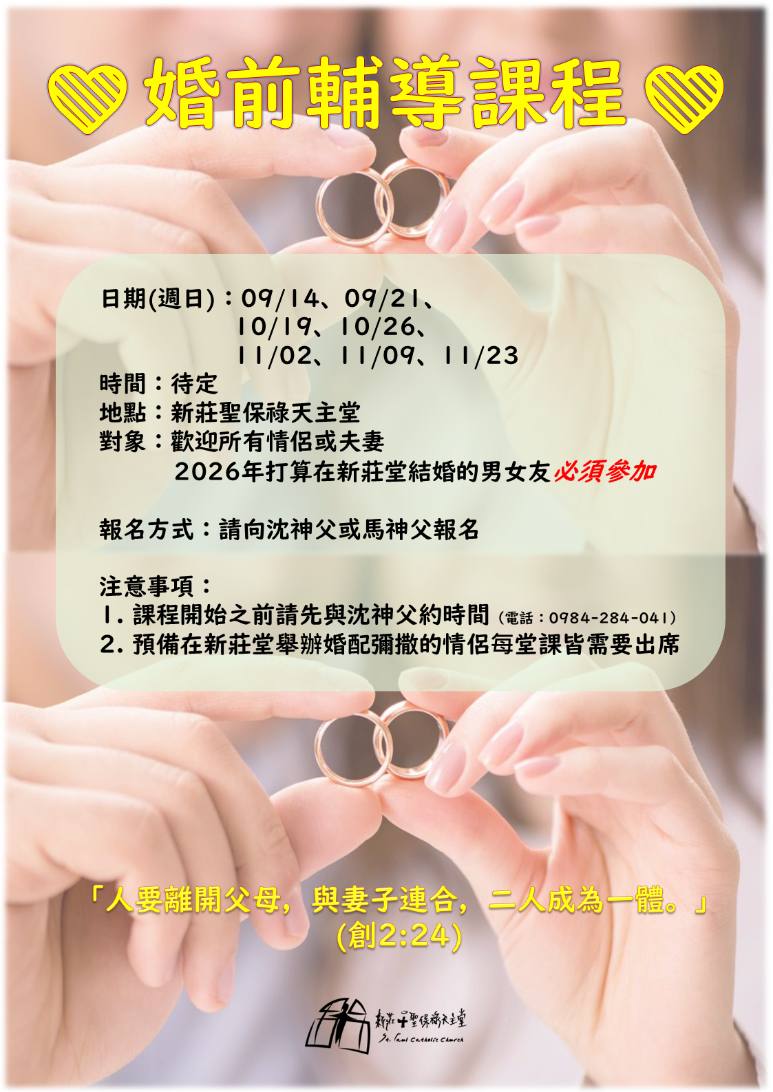 ⑥. 本堂將於9-11月舉辦婚前輔導課程,即日起開始向沈神父或馬神父報名,預備於2026年(明年)要結婚的情侶請務必要參加!