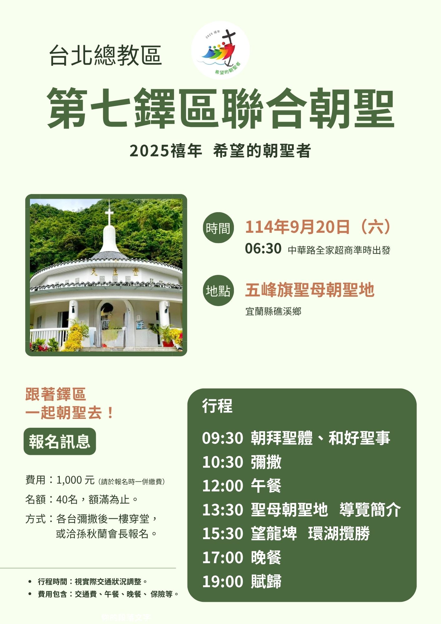 ★★★ 提醒有參加9月20日(六)鐸區聯合朝聖的人:當天早上6:30於中華路戶政事務所對面全家超商準時發車,請提早報到。