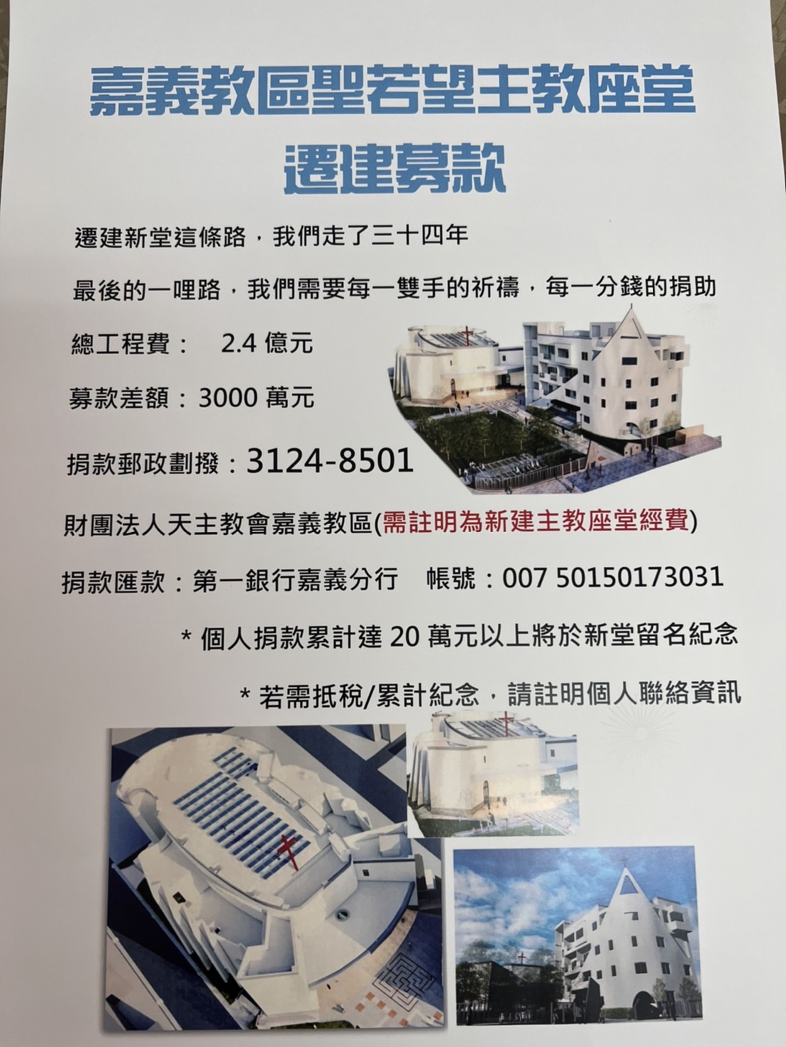 ①. 9月14日(日)嘉義若望主教座堂,為籌措建堂經費有義賣募款,歡迎大家支持。