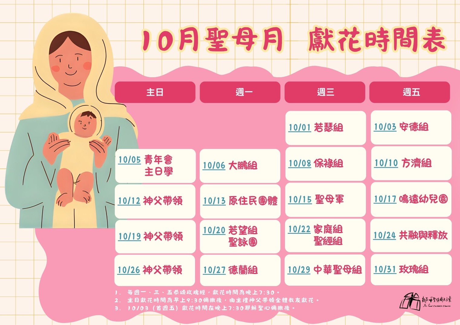 ④. 十月是聖母月,每週一、三、五晚上7:30在二樓聖堂有聖母敬禮獻花,請教友多踴躍參與。十月聖母獻花表已經張貼於一樓公佈欄,請各組注意獻花時間。