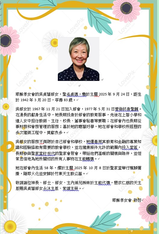 ⑥. 耶穌孝女會吳貞慧(聖名:貞德)修女蒙主恩照,將於10月8日(三)於聖家堂舉行殯葬彌撒,請大家撥空參禮並為亡者靈魂安息祈禱。
