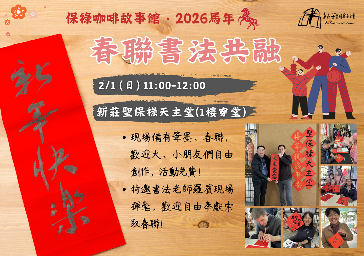 ③. 2月1日(日)主日彌撒後春聯書法共融活動在一樓川堂舉行,備有筆墨及春聯,歡迎大小朋友一起參與,本次也將邀請書法老師現場揮毫,歡迎自由奉獻索取。